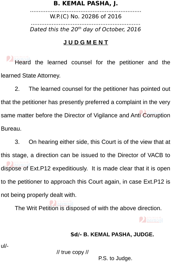 ഇതിന്മേൽ സർക്കാർ നടപടി എടുത്തില്ലെന്ന് ചൂണ്ടിക്കാട്ടിയാണ് ഹർജിക്കാരൻ ഹൈക്കോടതിയെ സമീപിച്ചത്. കഴിഞ്ഞ ദിവസം ഹർജി സിംഗിൾ ബെഞ്ച് പരിഗണിക്കുന്നതിനിടെ ഈ ആവശ്യമുന്നയിച്ച് വിജിലൻസ് ഡയറക്ടർക്ക് പരാതി നൽകിയിട്ടുണ്ടെന്ന് ഹർജിക്കാരന്റെ അഭിഭാഷകൻ അറിയിച്ചു. തുടർന്നാണ് വിജിലൻസ് ഡയറക്ടർ ഈ പരാതി വൈകാതെ തീർപ്പാക്കാൻ ഹൈക്കോടതി നിർദ്ദേശിച്ചത്.