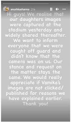 'ഞങ്ങളുടെ മകളുടെ ചിത്രങ്ങൾ സ്റ്റേഡിയത്തിൽ വച്ച് പകർത്തുകയും അത് പിന്നീട് വ്യാപകമായി ഷെയർ ചെയ്യപ്പെടുകയും ചെയ്തെന്ന് മനസ്സിലാക്കുന്നു. ഞങ്ങൾക്ക് നേരെയാണ് കാമറ എന്ന് അറിഞ്ഞിരുന്നില്ല, പ്രതീക്ഷിക്കാതെയാണ് അത് സംഭവിച്ചത്. ഞങ്ങൾ മുമ്പ് പറഞ്ഞിട്ടുള്ള കാരണങ്ങൾ കൊണ്ടുതന്നെ വാമികയുടെ ചിത്രങ്ങൾ പകർത്തുകയോ പ്രസിദ്ധീകരിക്കുകയോ ചെയ്യരുത്. നന്ദി', എന്ന് ഇരുവരും സോഷ്യൽ മീഡിയയിൽ കുറിച്ചു.