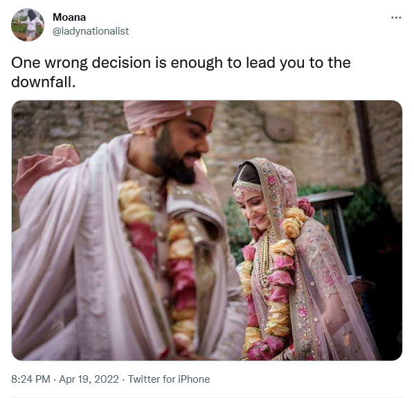 ഇതോടെ കോലിയെ കളിയാക്കി സോഷ്യൽ മീഡിയയിൽ ട്രോളുകൾ നിറയുന്നുണ്ടെങ്കിലും അതിപ്പോൾ ഒരുപടി കൂടി കടന്ന് ബോളിവുഡ് നടിയും കോലിയുടെ ഭാര്യയുമായ അനുഷ്ക ശർമയെക്കെതിരേ തിരിഞ്ഞിരിക്കുകയാണ്. ജീവിതത്തിലെ ഒരു തെറ്റായ തീരുമാനം മതി നിങ്ങളെ മോശം നിലയിലാക്കാൻ എന്ന തരത്തിലാണ് അനുഷ്ക ട്രോളുകൾക്കിരയാകുന്നത്.
