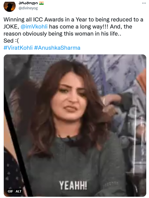 കോലിയുടെ മോശം ഫോമിന് കാരണമെന്തെന്ന ഒരു മീഡിയ ഗ്രൂപ്പിന്റെ ഔദ്യോഗിക ട്വിറ്റർ ഹാൻഡിലിലെ ചോദ്യത്തിന് അനുഷ്ക ശർമ എന്ന് ഉത്തരമായി ട്വീറ്റ് ചെയ്തവർ നിരവധിയാണ്.