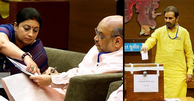 രണ്ട് കോൺഗ്രസ് വിമത എംഎൽമാർ വോട്ടു ചെയ്തശേഷം അമിത് ഷായെ ബാലറ്റ് പേപ്പർ കാണിച്ചെന്നാണു കോൺഗ്രസിന്റെ ആരോപണം. 182 അംഗ നിയമസഭയിൽ നിലവിലുള്ള 176 എംഎൽഎമാരും വോട്ടു രേഖപ്പെടുത്തിയതായി സംസ്ഥാന തിരഞ്ഞെടുപ്പു കമ്മിഷൻ അറിയിച്ചു. രാവിലെ 10 മണിക്ക് ആരംഭിച്ച വോട്ടെടുപ്പ് ഉച്ചകഴിഞ്ഞു രണ്ടരയോടെ അവസാനിച്ചു. അമിത് ഷായും സ്മൃതിയും വിജയമുറപ്പിച്ച തിരഞ്ഞെടുപ്പിൽ അഹമ്മദ് പട്ടേലിന്റെ ഫലത്തിലാണ് ആകാംക്ഷ നിലനിൽക്കുന്നത്. അഹമ്മദ് പട്ടേലിന് ജയിക്കാൻ 45 വോട്ടാണ് വേണ്ടത്.