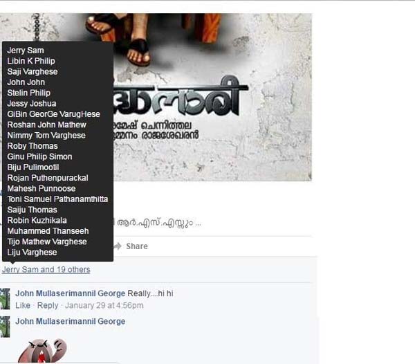 സംവിധാനം കുമ്മനം രാജശേഖരൻ, രമേശ് ചെന്നിത്തല എന്നിങ്ങനെ എഴുതിയിട്ടുണ്ട്. എ.കെ. ആന്റണി കെപിസിസി യോഗത്തിൽ പങ്കെടുത്ത് രൂക്ഷവിമർശനം ഉന്നയിച്ച അതേ ദിവസം തന്നെയാണ് എബിൻ ജോണിന്റെ പോസ്റ്റ് പ്രത്യക്ഷപ്പെട്ടത്. ഇത് പ്രചരിപ്പിച്ചത് മുഴുവൻ എ ഗ്രൂപ്പുകാരാണ്. ഐ ഗ്രൂപ്പുകാരിൽ ആരും ഇത് അറിഞ്ഞിരുന്നില്ല. കഴിഞ്ഞ ദിവസം കെപിസിസി അംഗം കെകെ റോയിസൺ ആണ് ഇത് സംബന്ധിച്ച് ഡിസിസി പ്രസിഡന്റിന് പരാതി നൽകിയത്.