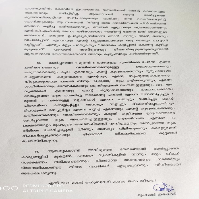 15 മാസത്തോളമായി ഇർഷാദ് കുഞ്ഞാലിക്കുട്ടിയെ ബന്ധപ്പെടാൻ ശ്രമിച്ചെങ്കിലും ഒരിക്കൽ പോലും ഫോൺ അറ്റൻഡ് ചെയ്യാൻ പോലും കുഞ്ഞാലിക്കുട്ടി തയ്യാറായിരുന്നില്ലെന്ന് ഇർഷാദ് പറയുന്നു. കഴിഞ്ഞമാസം കുഞ്ഞാലിക്കുട്ടിയുടെ ഫോൺ അറ്റൻഡ് ചെയ്ത വ്യക്തി ഇനി ഫോൺ വിളിച്ചാൽ ഇർഷാദിന് കൊല്ലുമെന്ന് ഭീഷണിപ്പെടുത്തുകയും ചെയ്തു. തുടർന്ന് പാറക്കൽ അബ്ദുള്ള എംഎൽഎയും സമാനരീതിയിലുള്ള ഭീഷണിയുമായി വന്നുവെന്ന് ഇർഷാദ് ആരോപിക്കുന്നു. മാത്രമല്ല നാമനിർദ്ദേശപത്രിക പിൻവലിക്കാൻ ഞങ്ങൾ കളിച്ച നാടകമാണെന്നും എൽഡിഎഫ് ഭരണം തീരാറായി ഇനി ഞങ്ങളാണ് വരാൻ പോകുന്നതെന്നും ഇനിയും വിവാദം ഉണ്ടാക്കിയാൽ തന്നെ തീർത്തു കളയും ഭീഷണിപ്പെടുത്തിയതായും പൊലീസിൽ നൽകിയ പരാതിയിൽ പറയുന്നു