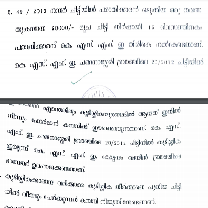 2013 ജനുവരിയിൽ ജോർജ് ജോസഫ് 10 ലക്ഷത്തിന്റെ ചിട്ടി പിടിച്ചെങ്കിലും ആ പണം നൽകാൻ കെഎസ്എഫ്ഇ തയ്യാറാകാതിരുന്നതോടെയാണ് പ്രശ്നങ്ങളുടെ ആരംഭം. അദ്ദേഹം ചിട്ടി കുടിശ്ശിക വരുത്തിയിട്ടുണ്ടെന്ന് ചൂണ്ടിക്കാണിച്ചാണ് കെഎസ്എഫ്ഇ പണം നൽകാൻ തയ്യാറാകാതിരുന്നത്. എന്നാൽ താൻ കുടിശിക വരുത്തിയിട്ടില്ലെന്നും താൻ ജാമ്യം നിന്ന് ചിട്ടി പിടിച്ചുകൊടുത്തയാളാണ് അടവിൽ മുടക്കം വരുത്തിയതെന്നുമാണ് ജോർജ് ജോസഫ് പറയുന്നത്. മാത്രമല്ല കോടികളുടെ സ്വത്ത് സെക്യുരിറ്റി വച്ചിട്ടാണ് ജോർജ് ജോസഫ് ചിട്ടി പണം ചോദിച്ചത്. എന്നാൽ ഓരോ തവണ കയറി ഇറങ്ങുമ്പോഴും ഓരോ കാരണങ്ങൾ പറഞ്ഞ് അവർ അദ്ദേഹത്തെ മടക്കി.