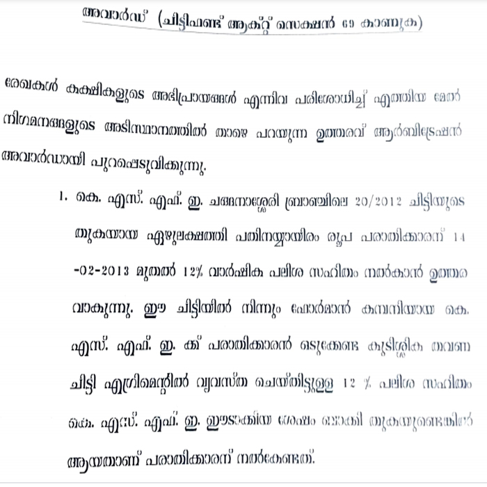 ഇത്തരം പ്രശ്നങ്ങൾ പരിഹരിക്കുന്നതിന് എല്ലാ സംസ്ഥാനങ്ങളിലും ആർബിട്രേറ്റർ ഓഫ് ചിറ്റ്സ് ആരംഭിക്കണമെന്നാണ് റിസർവ് ബാങ്ക് നിയമങ്ങളിൽ പറയുന്നത്. എന്നാൽ കേരളത്തിൽ ഇത്രയും കാലമായി അത്തരമൊരു സ്ഥാപനമുണ്ടായിരുന്നില്ല എന്നതാണ് ഏറ്റവും വലിയ വിരോധാഭാസം. ജോർജ് ജോസഫ് മനുഷ്യാവകാശ കമ്മീഷൻ ചെയർമാൻ ജെ.ബി കോശിയെ കണ്ട് പരാതി നൽകിയതിന്റെ ഭാഗമായി അദ്ദേഹത്തിന്റെ പ്രത്യേക ഉത്തരവിലൂടെയാണ് കേരളത്തിൽ ആർബിട്രേറ്റർ ഓഫ് ചിറ്റ്സ് ആരംഭിക്കുന്നത്. അവരുടെ ആദ്യത്തെ കേസായി ജോർജ് ജോസഫിന്റെ പരാതി തന്നെ പരിഗണിക്കുകയും ചെയ്തു. രണ്ട് ഭാഗത്തേയും വാദങ്ങളും രേഖകളും പരിശോധിച്ച ശേഷം ആർബിട്രേറ്റർ ഡോ. ജോർജ് ജോസഫിന് അനുകൂലമായ വിധി പുറപ്പെടുവിച്ചു. ചിട്ടി അടവിൽ വീഴ്‌ച്ച ഉണ്ടായിട്ടുണ്ടെങ്കിൽ വീഴ്‌ച്ച ഉണ്ടായ ചിട്ടിയുടെ പണം നൽകാതെ പിടിച്ചു വയ്ക്കാനുള്ള അവകാശം മാത്രമേ സ്ഥാപനത്തിന് ഉള്ളു, മറ്റ് ചിട്ടികൾ തടഞ്ഞുവയ്ക്കാനുള്ള അവകാശം അവർക്കില്ലെന്നും ആർബിട്രേറ്റർ പ്രസ്താവിച്ചു. സെക്യുരിറ്റിയായി നൽകിയ ഭൂമിയടക്കം കെഎഎഫ്ഇയിലുള്ളപ്പോൾ മറ്റൊരു പാസായ ചിട്ടി തടഞ്ഞുവയ്ക്കുന്നത് ശരിയല്ലെന്നും ആർബിട്രേറ്റർ പറഞ്ഞു. ഡോ. ജോർജ് ജോസഫിന്റെ പണം 12 ശതമാനം പലിശ സഹിതം നൽകാൻ ആർബിട്രേറ്റർ വിധിയായി.