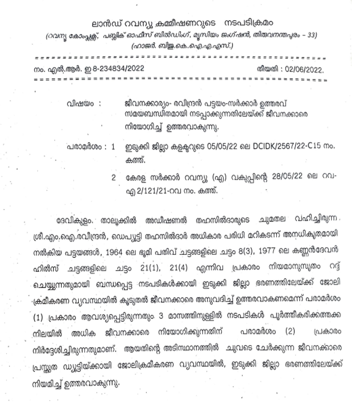 മൂന്നാറിലെ കെ ഡി എച്ച് ഉൾപ്പെടെ ദേവികുളം താലൂക്കിലെ 9 വില്ലേജുകളിൽ വിതരണം ചെയ്തിട്ടുള്ള രവീന്ദ്രൻ പട്ടയങ്ങൾ റദ്ദാക്കി, പുതിയ പട്ടയങ്ങൾ വിതരണം നടത്തുന്നതിനായി സർക്കാർ നടപടികൾ തുടങ്ങിയിരിക്കുകയാണ്. 1999 ൽ ലാൻഡ് അസൈന്മെന്റ് കമ്മിറ്റി ശുപാർശ പ്രകാരം എന്ന നിലയ്ക്ക് അന്നത്തെ അഡീഷണൽ തഹസിൽദാരായിരുന്ന എം ഐ രവീന്ദ്രൻ നൽകിയ 530 പട്ടയങ്ങൾ റദ്ദ് ചെയ്യാനാണ് ജില്ലാ കളക്ടർക്ക് റവന്യൂ വകുപ്പ് നിർദ്ദേശം നൽകിയിട്ടുള്ളത്.