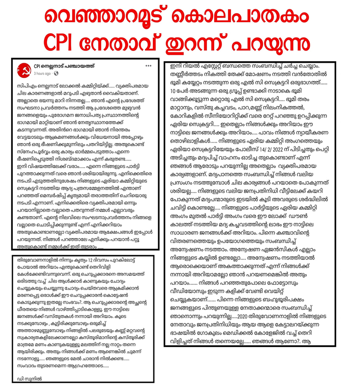 തിരുവനന്തപുരം: കേരളത്തിൽ രാഷ്ട്രീയ കോളിളക്കം സൃഷ്ടിച്ച ഒന്നായിരുന്നു വെഞ്ഞാറമൂട് ഇരട്ടകൊലപാതക കേസ്. സംഭവത്തിന് പിന്നിൽ രാഷ്ട്രീയ വൈരാഗ്യമെന്ന പൊലീസിന്റെ കുറ്റപത്രം തള്ളി ഫൊറൻസിക് റിപ്പോർട്ട് നേരത്തെ പുറത്തുവന്നിരുന്നു. രണ്ടു സംഘങ്ങൾ തമ്മിലുള്ള കുടിപ്പകയാണു കൊലപാതകത്തിൽ കലാശിച്ചതെന്നും രാഷ്ട്രീയ ഗൂഢാലോചനയ്ക്കു തെളിവില്ലെന്നും റിപ്പോർട്ടിൽ പറഞ്ഞിരുന്നു. ഇപ്പോൾ, ഇരട്ടക്കൊലപാതകത്തിൽ പുതിയ വെളിപ്പെടുത്തലുമായി സിപിഎമ്മിന്റെ മുൻ ലോക്കൽ കമ്മിറ്റി സെക്രട്ടറി രംഗത്തെത്തി. സിപിഎം വിട്ട്‌സിപിഐയിൽ ചേർന്ന ഡി സുനിലാണ് ഫേസ്‌ബുക്ക് പോസ്റ്റിലൂടെ കാര്യങ്ങൾ വെളിപ്പെടുത്തിയത്.