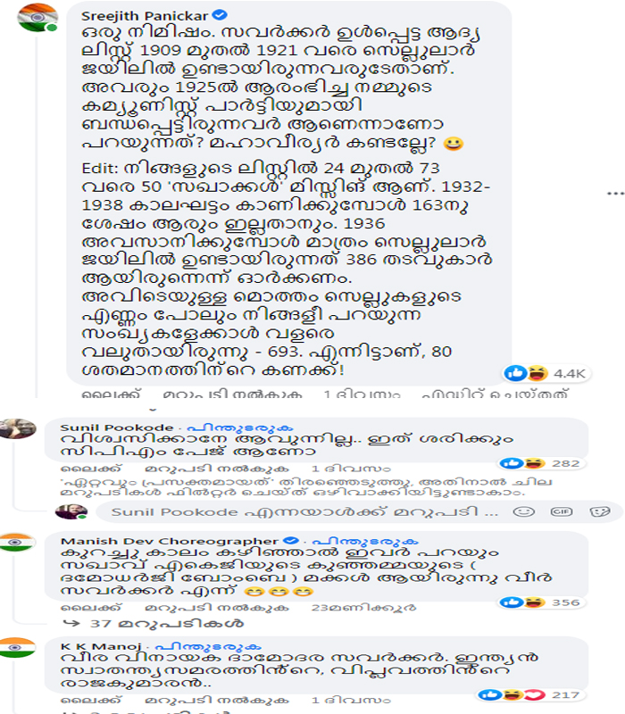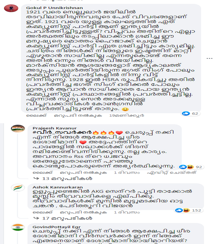 സിപിഎമ്മിന്റെ പോസ്റ്റ് 'അങ്ങനെ സവർക്കറെയും സഖാവാക്കി' എന്നു ബിജെപി. പ്രൊഫൈലുകൾ വ്യാഖ്യാനിക്കുന്നു. അതേസമയം, ധീരയോദ്ധാക്കൾ ജയിൽവാസം അനുഭവിച്ചപ്പോൾ സവർക്കർ മാപ്പെഴുതിക്കൊടുത്തു പുറത്തിറങ്ങി, അതാണ് ചരിത്രമെന്ന് സിപിഎം. പ്രൊഫൈലുകളും തിരിച്ചടിക്കുന്നു.