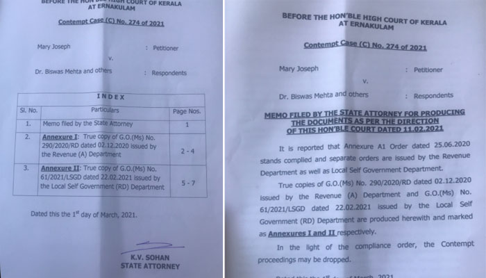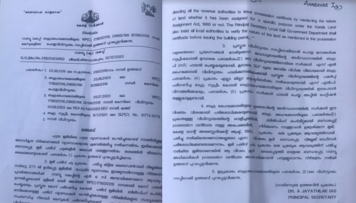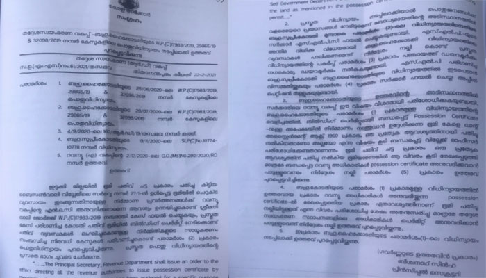 തദ്ദേശ സ്വയം ഭരണ(ആർ ഡി)വകുപ്പ് പ്രിൻസിപ്പിൽ സെക്രട്ടറി ബിശ്വാസ് സിൻഹ ,റവന്യൂ(എ)വകുപ്പ് പ്രിൻസിപ്പൽ സെക്രട്ടറി ഡോ.എ ജയതിലക് എന്നിവരാണ് ഉത്തരവുകളിൽ ഒപ്പുവച്ചിട്ടള്ളത്. സർക്കാരിനെതിരെയുള്ള കോടതി അലക്ഷ്യഹർജി പരിഗണിക്കവെയാണ സർക്കാർ അഭിഭാഷകൻ ഉത്തരവുകൾ ഹൈക്കോടതിയിൽ ഹാജരാക്കിയത്. സർക്കാർ ഉത്തരവുകൾ വെബ്ബ് സൈറ്റിൽ ഇടാറുണ്ടായിരുന്നെന്നും എന്നാൽ ഈ രണ്ട് ഉത്തരവും ഇതുവരെ സൈറ്റിൽ അപലോഡ് ചെയ്തിട്ടില്ലന്നും ഇത് പ്രതിഷേധം ഭയന്നാണെന്നുമുള്ള ആക്ഷേപവും ശക്തിപ്പെട്ടിട്ടുണ്ട്. ബൈസൺവാലി വില്ലേജിലെ സർവ്വേ നമ്പർ27/1-ൽ ഉൾപ്പെടുന്ന ഭൂമിയിൽ ചെറുകിട വ്യവസായം തുടങ്ങുന്നതിന് റവന്യൂവകുപ്പിന്റെ എൻ ഒ സി ആവശ്യപ്പെട്ട് ലാലി ജോർജ്ജ് ഫയൽ ചെയ്ത ഹർജ്ജിയുടെ തുടർനടപടകളിലാണ് സർക്കാർ ഇന്നലെ ഈ ഉത്തരവുകൾ ഹൈക്കോടതിയിൽ ഹാജരാക്കിയത്.