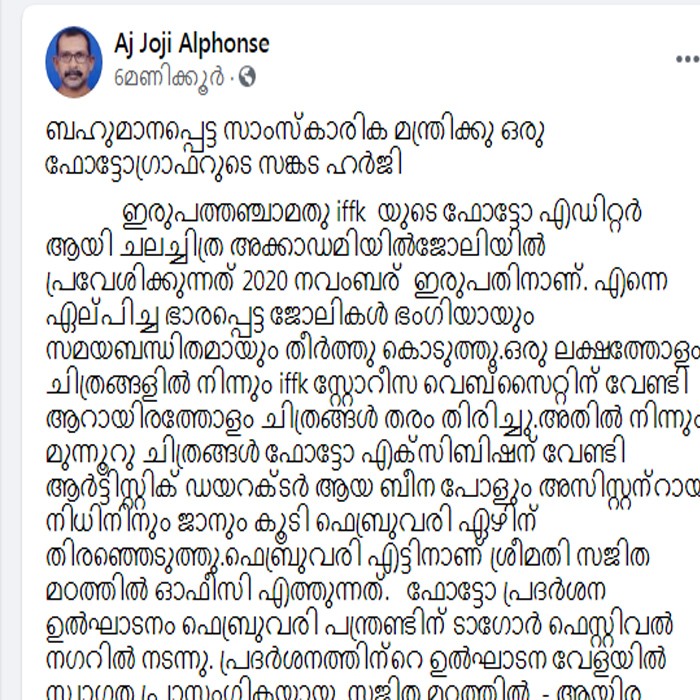 ഇരുപത്തഞ്ചാമതു iffk യുടെ ഫോട്ടോ എഡിറ്റർ ആയി ചലച്ചിത്ര അക്കാഡമിയിൽജോലിയിൽ പ്രവേശിക്കുന്നത് 2020 നവംബര് ഇരുപതിനാണ്. എന്നെ ഏല്പിച്ച ഭാരപ്പെട്ട ജോലികൾ ഭംഗിയായും സമയബന്ധിതമായും തീർത്തു കൊടുത്തു.ഒരു ലക്ഷത്തോളം ചിത്രങ്ങളിൽ നിന്നും iffk സ്റ്റോറീസ വെബ്സൈറ്റിന് വേണ്ടി ആറായിരത്തോളം ചിത്രങ്ങൾ തരം തിരിച്ചു.അതിൽ നിന്നും മുന്നൂറു ചിത്രങ്ങൾ ഫോട്ടോ എക്സിബിഷന് വേണ്ടി ആർട്ടിസ്റ്റിക് ഡയറക്ടർ ആയ ബീന പോളും അസിസ്റ്റന്റായ നിധിനിനും ജാനും കൂടി ഫെബ്രുവരി ഏഴിന് തിരഞ്ഞെടുത്തു.ഫെബ്രുവരി എട്ടിനാണ് ശ്രീമതി സജിത മഠത്തിൽ ഓഫീസി എത്തുന്നത്. ഫോട്ടോ പ്രദർശന ഉൽഘാടനം ഫെബ്രുവരി പന്ത്രണ്ടിന് ടാഗോർ ഫെസ്റ്റിവൽ നഗറിൽ നടന്നു. പ്രദർശനത്തിന്റെ ഉൽഘാടന വേളയിൽ സ്വാഗത പ്രാസംഗികയായ സജിത മഠത്തിൽ - ആയിര കണക്കിന് ചിത്രങ്ങളിൽ നിന്നും ശ്രീമതി സജിത മഠത്തിലും ബീനാപോലും കൂടിയാണ് ചിത്രങ്ങൾ തിരഞ്ഞെടുത്തതെന്ന് അവകാശപ്പെട്ടു.