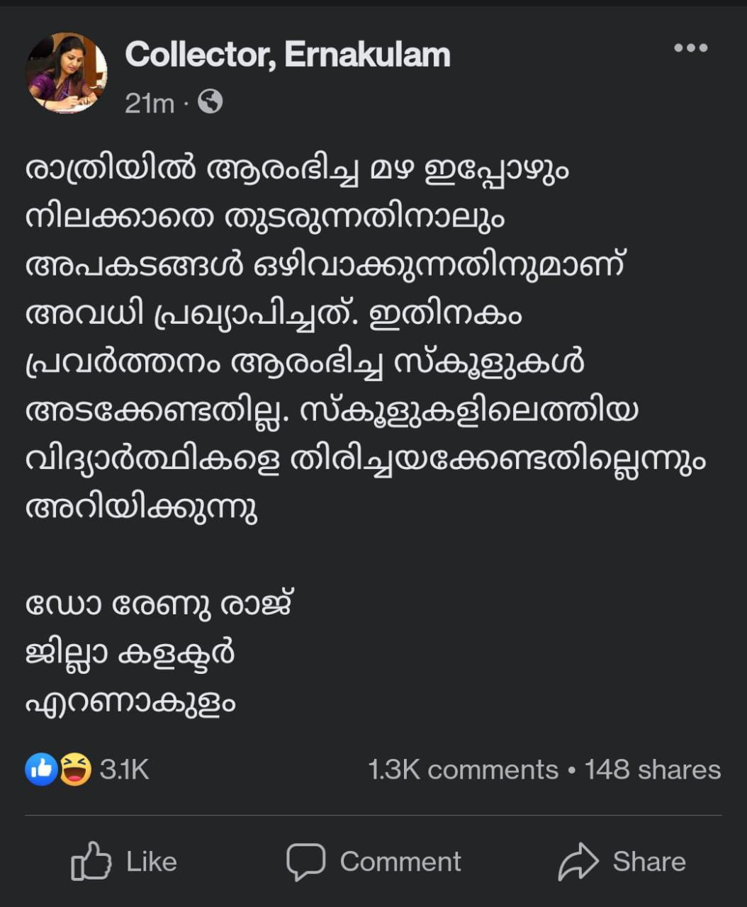 ആകാശം നോക്കിയാൽ പോലും നല്ല മഴ പെയ്യുമെന്ന് ഇന്നലെ തന്നെ ഏവർക്കും അറിയാം. എന്നിട്ടും കളക്ടർക്ക് ഇത് അറിയാൻ കഴിയാതെ പോയി. കഴിഞ്ഞ ആഴ്ച എറണാകുളത്തെ ജില്ലാ കളക്ടറായി ചുമതലയേറ്റെടുത്ത വ്യക്തിയാണ് രേണു രാജ്. ഐഎഎസുകാരനായ ശ്രീറാം വെങ്കിട്ടരാമന്റെ ഭാര്യ. ആലപ്പുഴ കളക്ടറായിരുന്ന ശ്രീറാമിനെ കഴിഞ്ഞ ദിവസം എറണാകുളം ആസ്ഥാനമായ സിവിൽ സപ്ലൈസ് കോർപ്പറേഷനിലേക്ക് മാറ്റി നിയോഗിച്ചിരുന്നു. ഇതിനെതിരെ ഭക്ഷ്യമന്ത്രി ജി ആർ അനിൽ പ്രതിഷേധവും അറിയിച്ചു. മാധ്യമ പ്രവർത്തകൻ കെ എം ബഷീറിനെ കാറിടിച്ചു കൊന്ന കേസിലെ പ്രതിയാണ് ശ്രീറാം.