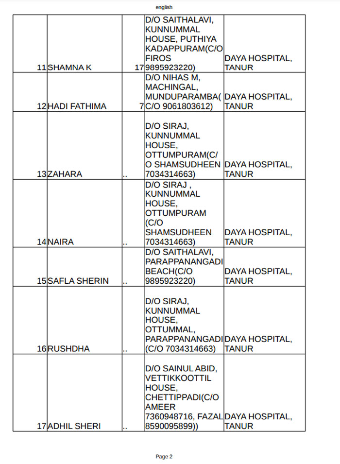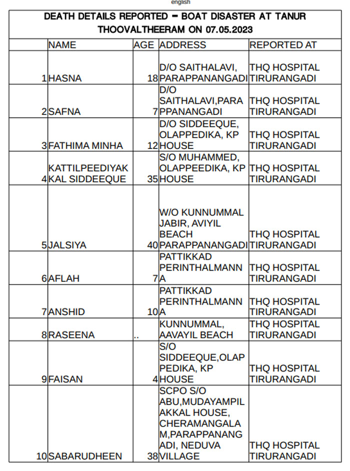 22 പേർ കയറേണ്ട ബോട്ടിൽ അതിൽ അധികം പേരുണ്ടായിരുന്നു; പുഴയുടെ നടുവിൽ വച്ച് ഇടത്തേക്ക് ചെരിഞ്ഞപ്പോൾ മുകളിലുണ്ടായിരുന്ന ആരൊക്കെയോ വെള്ളത്തിലേക്കു വീണു; പരിഭ്രാന്തിയിൽ ആളുകൾ അങ്ങോട്ടും ഇങ്ങോട്ടും നീങ്ങിയപ്പോൾ പെട്ടെന്നു ബോട്ട് മുങ്ങി; മരിച്ച 22 പേരേയും തിരിച്ചറിഞ്ഞു; താനൂർ ദുരന്തത്തിൽ ഇരകളായവർ ഇവർ