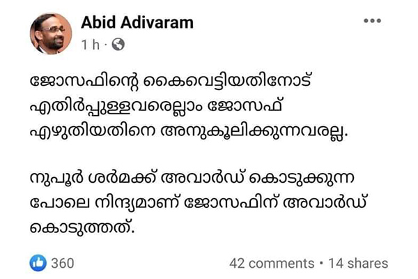 മനുഷ്യവകാശ പ്രവർത്തകൻ, സോഷ്യൽ മീഡിയ ആക്റ്റീവിസ്റ്റ് എന്നീ നിലകളിൽ പ്രശ്സതനായ ആബിദ് അടിവാരം, തന്റെ ഫേസ്ബുക്ക് പേജിൽ അങ്ങേയറ്റത്തെ നിന്ദയാണ് ജോസഫ് മാസ്റ്ററെ കുറിച്ച് എഴുതുന്നത്. ''ജോസഫിന്റെ കൈവെട്ടിയതിനോട്് എതിർപ്പുള്ളവർപോലും, ജോസഫ് എഴുതിയതിനെ അനുകൂലിക്കുന്നവർ അല്ല. നൂപുർ ശർമ്മക്ക് അവാർഡ് കൊടുക്കുന്നപോലെ നിന്ദ്യമാണ്, ജോസഫിന് അവാർഡ് കൊടുക്കുന്നത്' എന്നാണ് ആബിദ് എഴുതിയത്.