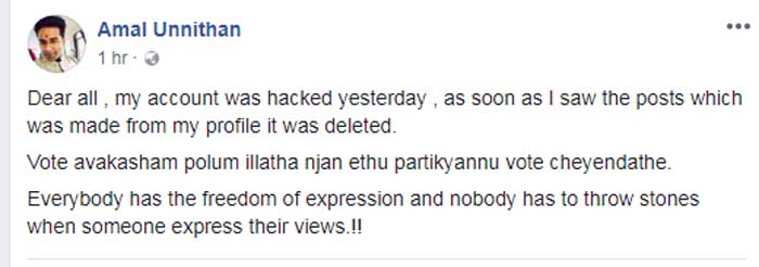 തന്റെ ഫേസ്ബുക്ക് അക്കൗണ്ട് ഹാക്ക് ചെയ്യപ്പെട്ടെന്നും താനല്ല ആ പോസ്റ്റുകളൊന്നും ഇട്ടതെന്നുമാണ് അമലിന്റെ പുതിയ വിശദീകരണം. വോട്ടവകാശം പോലുമില്ലാത്ത ഞാൻ ഏത് പാർട്ടിക്കാണ് വോട്ടു ചെയ്യേണ്ടതെന്നും അമൽ വിശദീകരണ പോസ്റ്റിൽ ചോദിക്കുന്നു. എല്ലാവർക്കും അഭിപ്രായ സ്വാതന്ത്ര്യം ഉണ്ടെന്നും ആരെങ്കിലും ഒരു അഭിപ്രായം പറഞ്ഞതിന്റെ പേരിൽ കല്ലെറിയേണ്ട കാര്യമില്ലെന്നും അമൽ പറയുന്നു.