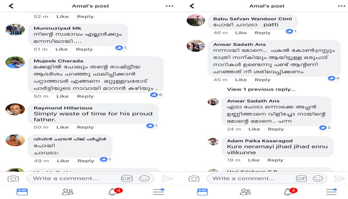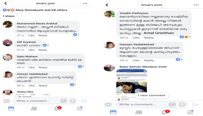 അച്ഛന്റെ വോട്ട് കോൺഗ്രസിനാണെന്നും എന്റെ വോട്ട് ബിജെപിക്കെന്നുമായിരുന്നു അമൽ ഉണ്ണിത്താന്റെ ഫേസ്ബുക്ക് പോസ്റ്റ്. വിമർശനങ്ങൾ കമന്റായി വന്നപ്പോൾ ഇതിന് രൂക്ഷഭാഷയിൽ തന്നെ അമൽ പ്രതികരണവും രേഖപ്പെടുത്തി. കോൺഗ്രസ് ഉണ്ണിത്താനോട് കാട്ടിയിട്ടുള്ളത് നെറികേടാണെന്നും കോൺഗ്രസ് അഴിമതി പാർട്ടിയാണെന്നും എന്റെ അച്ഛന് പുല്ലുവില കൽപിച്ച പാർട്ടിയാണ് കോൺഗ്രസെന്നും അമലിന്റെ കമന്റിൽ പറയുന്നു.