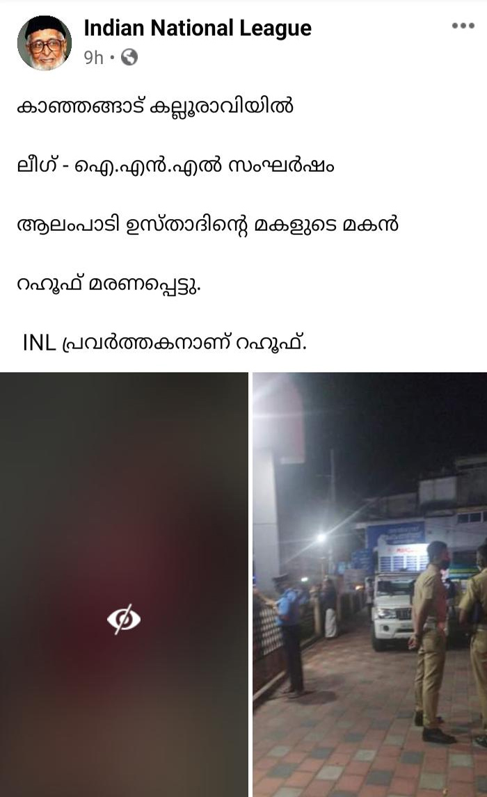 അതിനിടെ കൊല്ലപ്പെട്ടത് ഐഎൻഎൽ പ്രവർത്തകനാണെന്ന് അവകാശപ്പെട്ട് ഇന്ത്യൻ നാഷണൽ മുസ്ലിംലീഗ് നേതാക്കളും രംഗത്തെത്തി. ലീഗ് - ഐഎൻഎൽ സംഘർഷത്തിൽ ആലംപാടി ഉസ്താദിന്റെ മകളുടെ മകൻ റഹൂഫ് കൊല്ലപ്പെട്ടുവെന്നാണ് ഐഎൻഎല്ലിന്റെ ഫേസ്ബുക്ക് പേജിൽ കുറിച്ചിരിക്കുന്നത്.