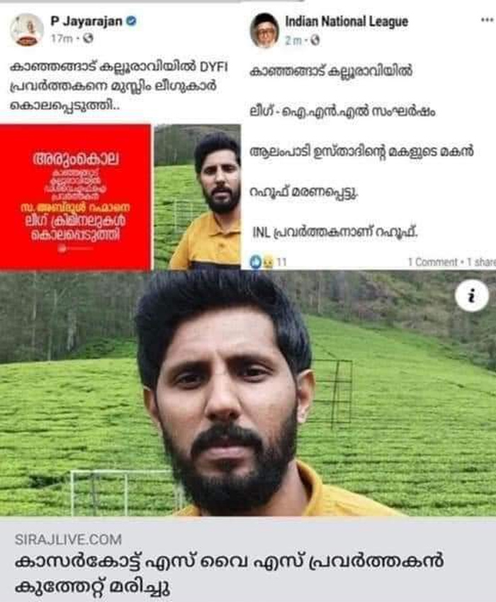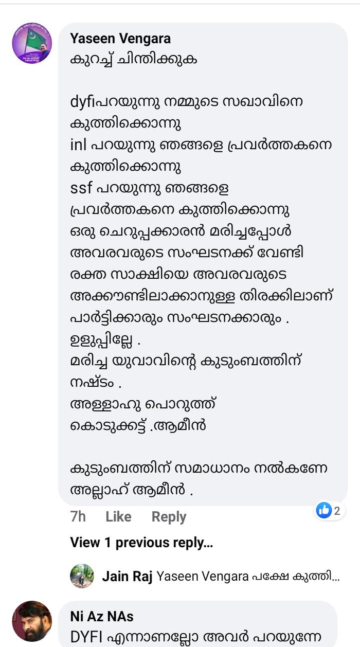 ഡിവൈഎഫ്ഐ പറയുന്നു ഞങ്ങളുടെ സഖാവിനെ കുത്തിക്കൊന്നുവെന്ന്; ഐഎൻഎൽ പറയുന്നതുകൊല്ലപ്പെട്ടത് തങ്ങളുടെ പ്രവർത്തകനെന്ന്; എസ്എസ്എഫും കാന്തപുരവും പറയുന്നത് അത് ഞങ്ങളുടെ സജീവ പ്രവർത്തകനെന്ന്; കാഞ്ഞങ്ങാട്ട് കുത്തേറ്റ് മരിച്ച അബ്ദുൽ റഹ്മാൻ ഔഫിന്റെ രാഷ്ട്രീയ ബന്ധത്തെച്ചൊല്ലി സോഷ്യൽ മീഡിയയിൽ തർക്കം