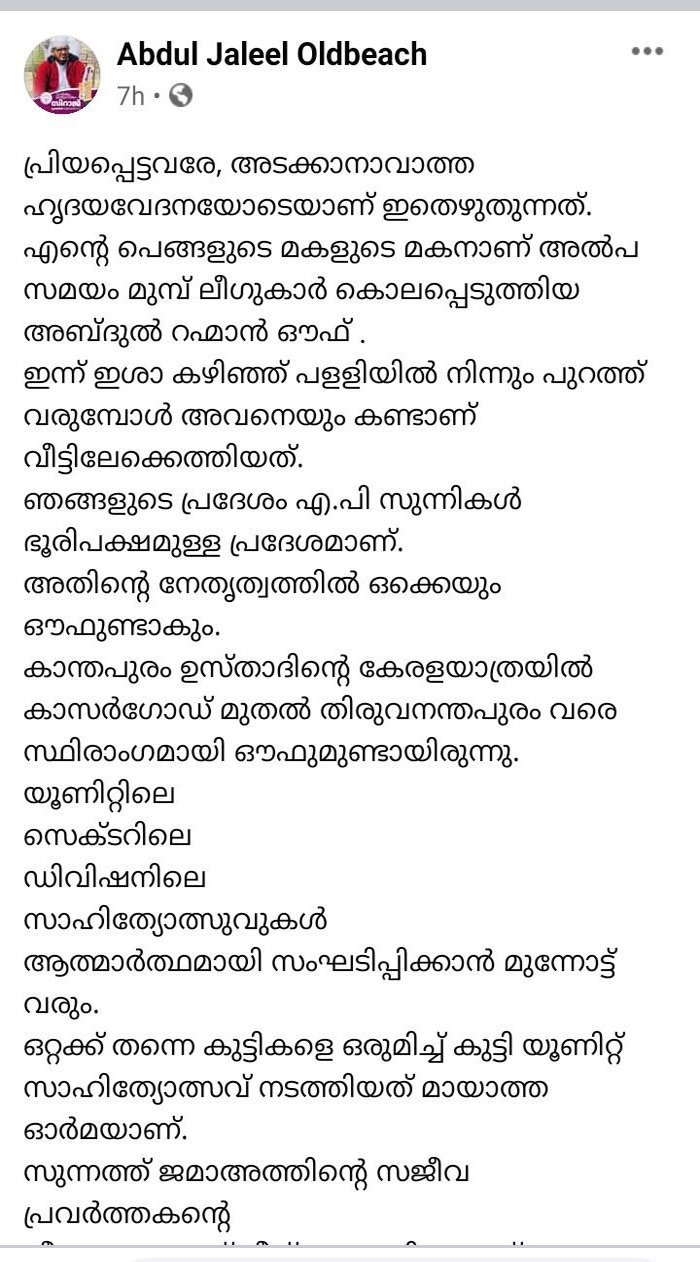 അതിനിടെ ലീഗുകാർ കൊലപ്പെടുത്തിയ അബ്ദുൽ റഹ്മാൻ എംഎസ്എഫിന്റെ സജീവ പ്രവർത്തകനായിരുന്നുവെന്ന് വ്യക്തമാക്കി അമ്മയുടെ സഹോദരൻ കൂടിയായ അബ്ദുൾ ജലീൽ രംഗത്തെത്തി. ഭൂരിപക്ഷവും എ പി സുന്നികൾ താമസിക്കുന്ന പ്രദേശമാണ് കാഞ്ഞാങ്ങാട് കല്ലൂരാവി മുണ്ടത്തോടെന്നും പൊതുപ്രവർത്തനത്തിന്റെ നേതൃത്വം വഹിച്ചിരുന്നത് അബ്ദുൾ റഹ്മാൻ ഔഫാണെന്നും ഫേസ്ബുക്ക് പോസ്റ്റിൽ അബ്ദുൾ ജലീൽ പറയുന്നു. കാന്തപുരം ഉസ്താദിന്റെ കേരളയാത്രയിൽ കാസർകോട് മുതൽ തിരുവനന്തപുരം വരെ സ്ഥിരാംഗമായി ഔഫുമുണ്ടായിരുന്നു. യൂണിറ്റിലും സെക്ടറിലും ഡിവിഷനിലും സാഹിത്യോത്സവങ്ങളിലും സംഘാടനചുമതല നിർവഹിച്ചിരുന്നുവെന്നും അബ്ദുൾ ജലീൽ ഫേസ്ബുക്കിലൂടെ വ്യക്തമാക്കുന്നുണ്ട്. സുന്നത്ത് ജമാഅത്തിന്റെ സജീവ പ്രവർത്തകനായിരുന്നു അ്ബ്ദുൾ റഹ്മാൻ ഔഫെന്നും ഫേസ്ബക്കിലൂടെ അബ്ദുൾ ജലീൽ പറയുന്നുണ്ട്. കാന്തപുരം എ പി ഉസ്താദ് നേരിട്ടുതന്നെ മുസ്ലീലീഗിന്റെ കഠാരരാഷ്ട്രീയത്തിനെതിരെ രംഗത്ത് എത്തിയിട്ടുണ്ട്.