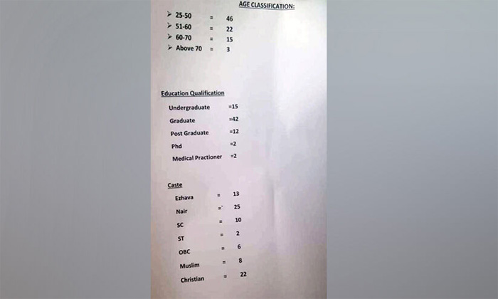 വാർത്താസമ്മേളനത്തിനായി കെപിസിസി പ്രസിഡന്റ് മുല്ലപ്പള്ളി രാമചന്ദ്രൻ സ്ഥാനാർത്ഥി പട്ടികയ്‌ക്കൊപ്പം കൊണ്ടുവന്ന കുറിപ്പിലാണ് മത-ജാതി സമവാക്യങ്ങളുടെ കണക്കുകളും ഉള്ളത്. സ്ഥാനാർത്ഥികളുടെ വിദ്യാഭ്യാസയോഗ്യതയുടെ കണക്കുകളും, പ്രായവും കുറിപ്പിനൊപ്പമുണ്ടായിരുന്നു. പുതുമയുള്ളതും യുവാക്കൾക്ക് മൂൻതൂക്കം നൽകുന്ന പട്ടികയാണ് കെപിസിസി അധ്യക്ഷൻ പ്രഖ്യാപിച്ചത്. 25നും 50 നും ഇടയിൽ പ്രായമുള്ളവർ 46 പേരും, 51 മുതൽ 60 വരെ പ്രായമുള്ള 22 പേരും, 60 നും 70 ന് ഇടയിലുള്ള 15 പേരും, എഴുപതിനു മുകളിൽ പ്രായമുള്ള മൂന്നുപേരുമാണ് പട്ടികയിൽ ഇടം പിടിച്ചത്.