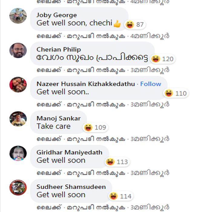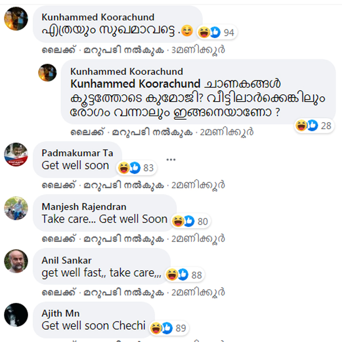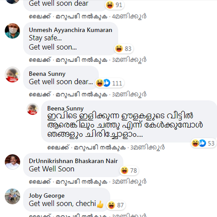 സാധാരണ പോലെ പ്രവീണയുടെ ഫേസ്ബുക്ക് സുഹൃത്തുകൾ, രോഗം മാറി വേഗം സുഖം പ്രാപിക്കട്ടെ എന്ന ആശംസകൾ നേർന്നു. എന്നാൽ, ഒരാൾക്ക് രോഗം ബാധിച്ചത് ആഘോഷിക്കുകയാണ് സൈബർ അക്രമികൾ. നേരത്തെ കൊലപാതകാഹ്വാനം വരെ നടത്തിയവർക്ക് ഇതൊരു ചെറിയ കാര്യം. ടേക് കെയർ, ഗെറ്റ് വെൽ സൂൺ എന്നൊക്കെ ആശംസകൾ നേർന്ന കമന്റുകളിൽ സ്മൈലികൾ ഇട്ടാണ് ഏഷ്യാനെറ്റ് ലേഖിക കോവിഡ് പോസിറ്റീവായതിന്റെ ആഹ്ലാദ പ്രകടനം.