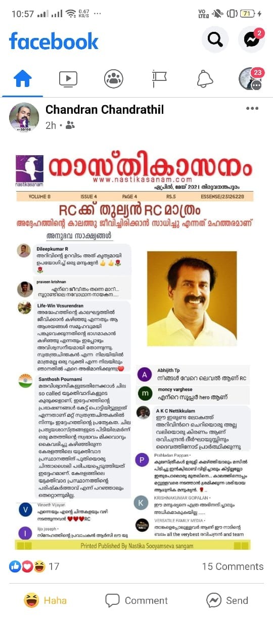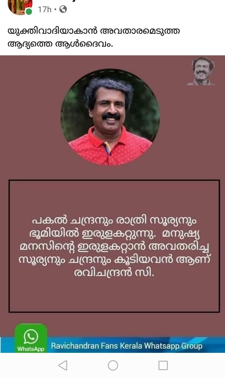 തിരുവനന്തപുരം: 'രവിചന്ദ്രാഷ്ഠകം പുണ്യം.... എപ്പഠേ സുസമാഹിത.... മുഛ്യതേ മത ചിന്തായാ.... ലഭ്യതേ സംഘദർശനം'.... ആർ.എസ്.എസിന്റെ ഗണഗീതത്തിന്റെ ശൈലിയിൽ രവിചന്ദ്രാഷ്ഠകം എന്ന ഈ ഗീതം ഇപ്പോൾ പുതുതായി വന്ന ക്ലബ് ഹൗസ് തൊട്ട് സിപിഎം സൈബർ സഖാക്കളുടെ വാട്സാപ്പ് ഗ്രൂപ്പുകളിൽ വരെ വ്യാപകമായി പ്രചരിക്കുകയാണ്. പ്രമുഖ സ്വതന്ത്ര ചിന്തകനും എഴുത്തുകാരും ശാസ്ത്ര പ്രഭാഷകനുമായ സി രവിചന്ദ്രനെ, സംഘപരിവാർ അനുഭാവിയാക്കി വ്യക്തിഹത്യ ചെയ്യുകയാണ് സിപിഎം സൈബർ സഖാക്കളും ഇസ്ലാമിക മതമൗലികവാദ ഗ്രൂപ്പുകളും.