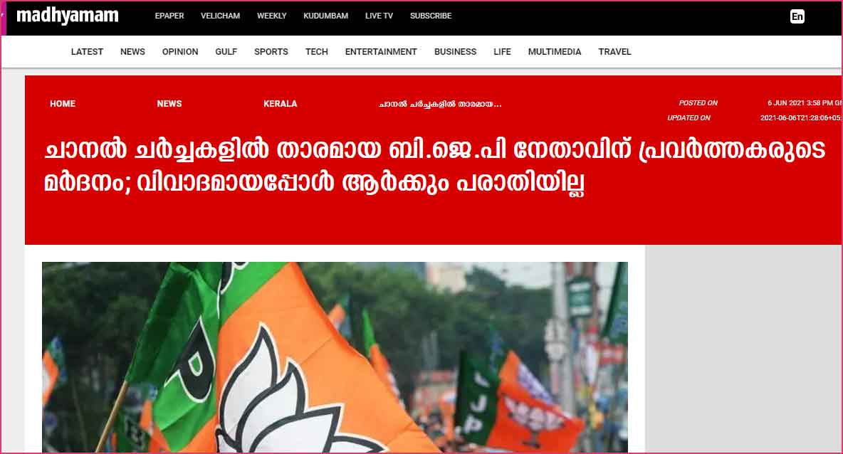 ചാനൽ ചർച്ചകളിലെ സജീവ സാന്നിധ്യവും പാലക്കാട് ജില്ലക്കാരനുമായ നേതാവിനാണ് ബിജെപി പ്രവർത്തകരുടെ തന്നെ മർദനമേറ്റത്. വനിത പ്രാദേശിക നേതാവുമായുള്ള ഇയാളുടെ ബന്ധമാണ് അടിയിൽ കലാശിച്ചതെന്ന് സൂചനയുണ്ട്. എന്നാൽ, ഇരുകൂട്ടർക്കും പരാതിയൊന്നുമില്ലാത്തതിനാൽ പൊലീസ് കേസെടുത്തിട്ടില്ലെന്നും മാധ്യമം വാർത്തയിൽ വിശദീകരിക്കുന്നു.
