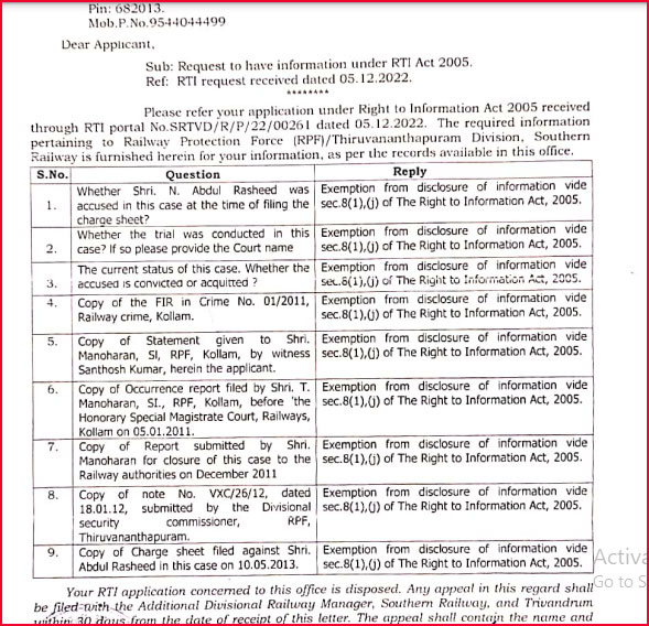 സ്റ്റോപ്പില്ലാത്ത റെയിൽവേ സ്റ്റേഷനിൽ രാജധാനി എക്സ്പ്രസ് ചങ്ങല വലിച്ച് നിർത്തുകയും ലോക്കോപൈലറ്റിനോട് മോശമായി പെരുമാറുകയും ചെയ്ത കേസിൽ പ്രതിയായ ഡിവൈ.എസ്പിയെക്കുറിച്ചും സംഭവത്തിന്റെ വിശദാംശങ്ങൾ തേടിയും നൽകിയ വിവരാവകാശ അപേക്ഷ നിരസിച്ചിരിക്കുകയാണ് റെയിൽവേയിലെ വിവരാവകാശ ഉദ്യോഗസ്ഥൻ. ഇത് വ്യക്തിഗത വിവരങ്ങളാണെന്നും വിവരാവകാശ നിയമം 8(1)(ജെ) പ്രകാരം നൽകാൻ കഴിയില്ലെന്നുമാണ് അറിയിച്ചിട്ടുള്ളത്.