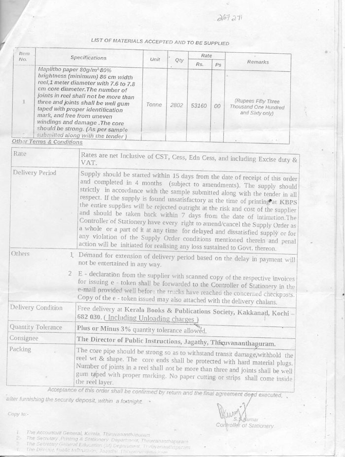 49 രൂപ ക്വാട്ട് ചെയ്ത കമ്പനിയെ ഒഴിവാക്കി ക്വട്ടേഷൻ നൽകാത്ത കമ്പനികളിൽ നിന്നും 52, 53 രൂപയ്ക്ക് പേപ്പർ വാങ്ങി. സൗജന്യമായി എത്തിക്കേണ്ട പേപ്പറിന് ലോറി വാടകയായി പത്ത് കോടിയും നൽകി. 2019-20 കാലത്ത് ടെൻഡർ പോലുമില്ല. ഒരു കിലോയ്ക്ക് 76.60 രൂപ നിരക്കിൽ 83. 63 കോടിയുടെ പേപ്പറാണ് വാങ്ങിയത്. അതേ സമയം ഈ കമ്പനിയോട് മറ്റൊരു പേരിൽ ക്വട്ടേഷൻ ചോദിച്ചപ്പോൾ ഇതേ പേപ്പറിന് കിലോയ്ക്ക് 54 രൂപയാണ് രേഖപ്പെടുത്തിയത്. കൂടിയ നിരക്കിൽ വാങ്ങിയതോടെ 24 കോടിയുടെ തട്ടിപ്പാണ് നടന്നത്.